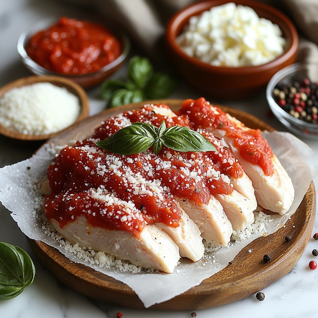 - Add Marinara Sauce: Pour marinara sauce around and slightly over the chicken breasts, being careful not to completely cover the ricotta layer to allow it to brown and set.