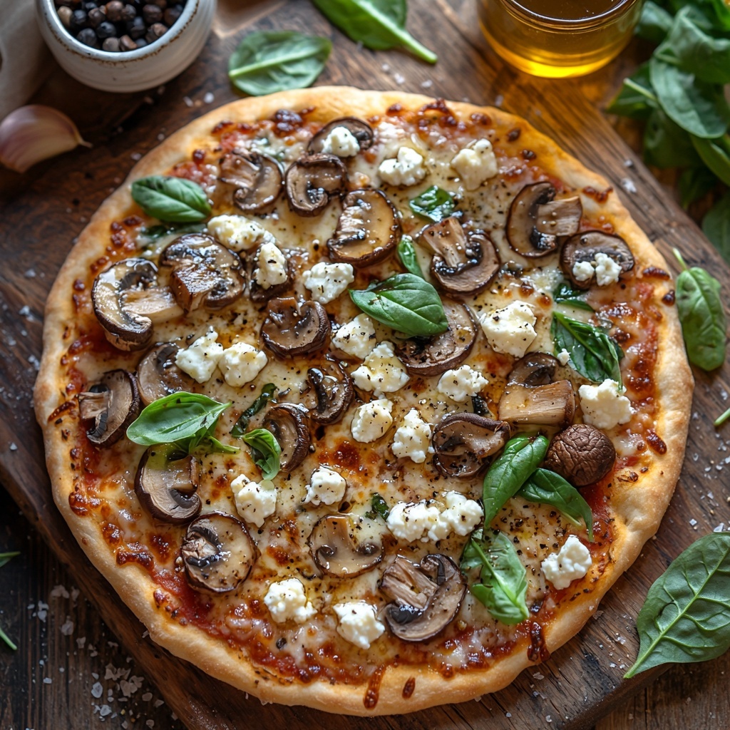 This Best Balsamic Mushroom Goat Cheese Pizza with Spinach Delight is a flavorful vegetarian pizza topped with sautéed mushrooms, fresh spinach, creamy goat cheese, and mozzarella, all drizzled with a tangy balsamic glaze. Ideal for a quick and tasty homemade meal, this pizza offers a perfect blend of earthy mushrooms, vibrant greens, and rich cheeses on a crispy crust.