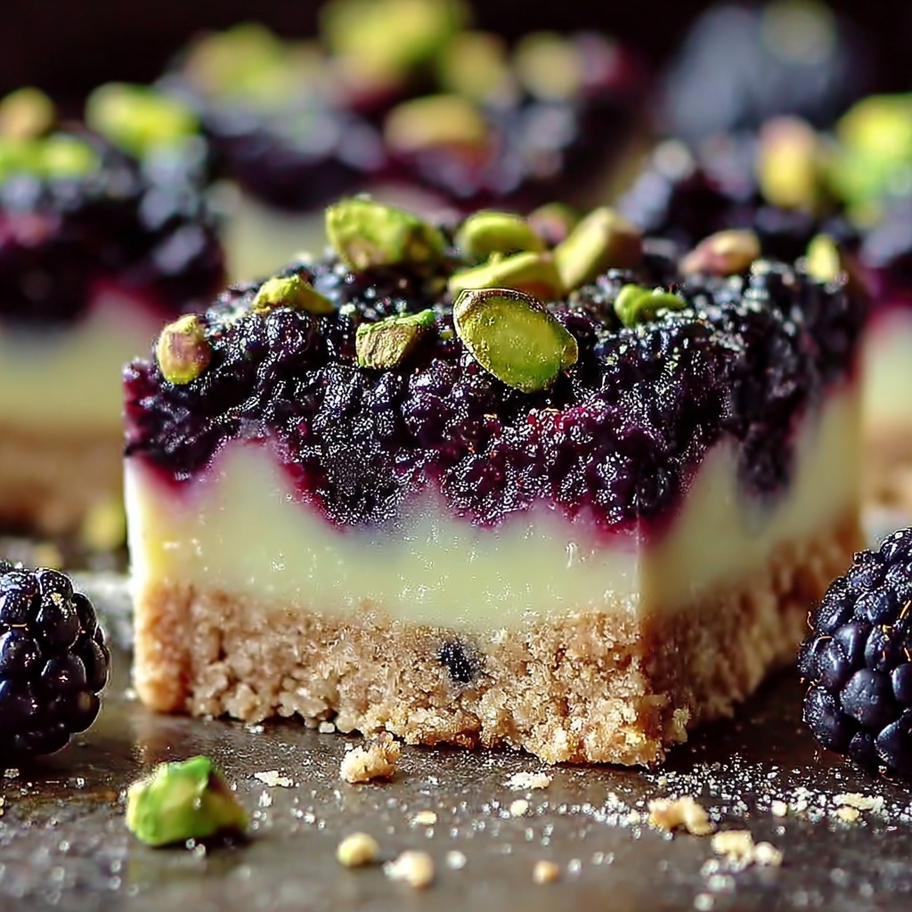 - Add Pistachio Topping: Sprinkle the pistachio crumb topping over the blackberry layer, pressing gently to adhere.