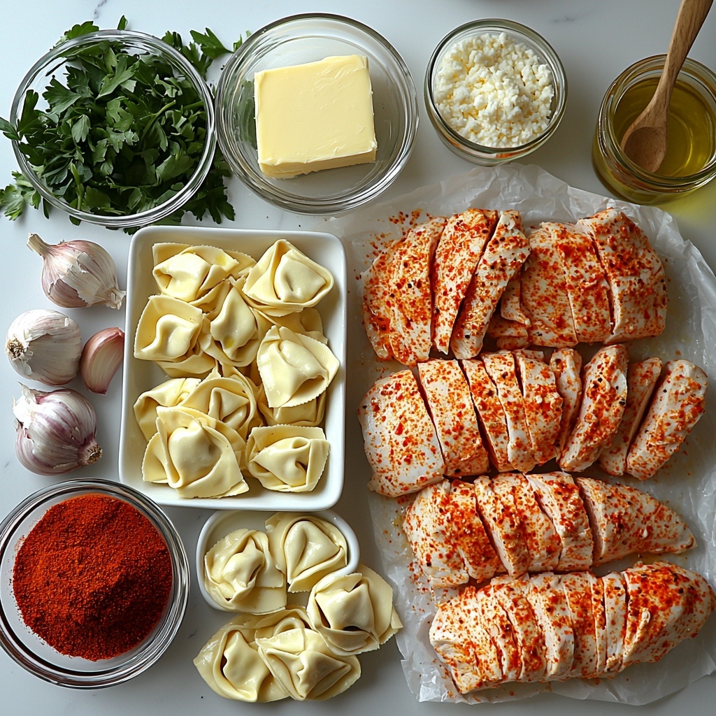 - Serve: Slice the rested chicken breasts into strips. Place them on top of the coated tortellini. Garnish with chopped parsley and sprinkle red pepper flakes over the dish before serving to add a hint of heat.
