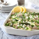 A wholesome one-pot Chicken & Green Vegetable Pilaf featuring tender chicken breast, fresh zucchinis, asparagus, and peas cooked with fragrant long grain rice in chicken stock. Enhanced with crumbled feta cheese, fresh lemon juice, and parsley for a bright, satisfying dinner perfect for busy weeknights.