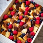 This decadent Bread Pudding recipe combines soft brioche bread with fresh blueberries and raspberries, enhanced by a rich custard mixture and studded with chocolate chips for a delightful dessert or brunch dish. Baked to golden perfection, this comforting pudding offers a perfect balance of fruity freshness and chocolatey indulgence.