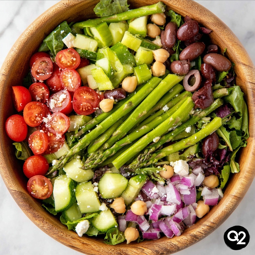 - Combine Salad Ingredients: In a large salad bowl, add the mixed greens, blanched asparagus pieces, halved grape tomatoes, rinsed chickpeas, peeled and diced cucumber, diced red onion, pitted kalamata olives, and crumbled feta cheese. Gently toss to distribute the ingredients evenly.