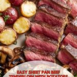 This Christmas Beef Tenderloin recipe features a perfectly roasted 2-pound beef tenderloin paired with savory baby red potatoes and cremini mushrooms, all baked together on a sheet pan. Finished with a rich blue cheese cream sauce, this elegant and hearty dish is perfect for a festive holiday meal serving four people.