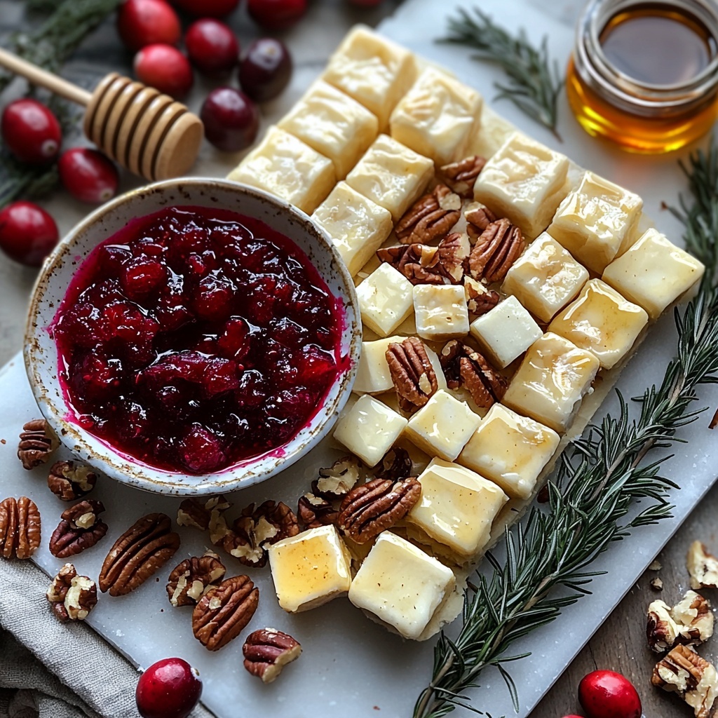 Delight your guests with these elegant Cranberry Brie Bites, perfect for holiday parties or cozy gatherings. This easy-to-make appetizer features buttery puff pastry filled with creamy brie cheese, tangy whole berry cranberry sauce, and crunchy toasted pecans, all baked to golden perfection and garnished with fresh rosemary. A drizzle of honey or balsamic glaze adds a subtle sweetness that complements the savory and tart flavors.