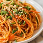 - Combine Noodles and Sauce: Toss the cooked spaghetti with the sliced carrot and the peanut sauce in a large bowl. Add some of the reserved pasta water if needed to loosen the sauce and ensure it coats the noodles evenly.