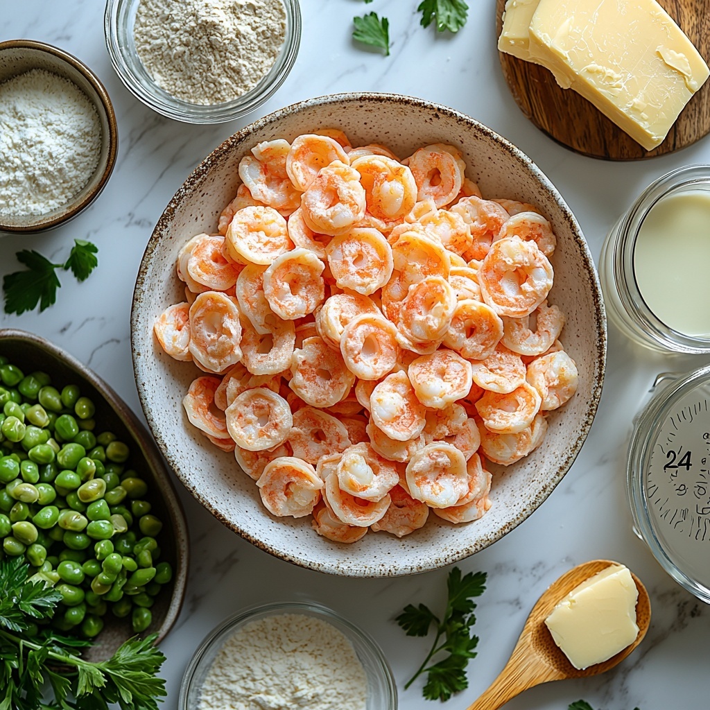 This recipe relies on straightforward, accessible ingredients that each play a crucial role, whether it’s the creamy texture from the cheese, the savory punch from the shrimp, or the fresh pop from the peas. Every element contributes to a perfectly balanced and satisfying dish you’ll love making again and again.