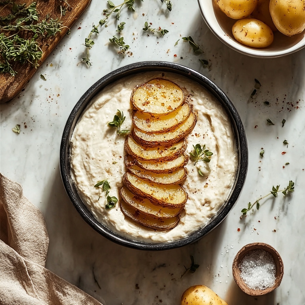 Combine olive oil, melted butter, minced garlic, sea salt, black pepper, and fresh thyme leaves in a small bowl. This luscious mixture will seep into every cut, layering the potatoes with rich aromas and savory notes.