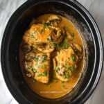 Tender and flavorful pork chops slow-cooked to perfection in a rich mushroom and onion gravy. This Crock Pot Pork Chops recipe features seasoned pork chops browned for depth of flavor, then slow-cooked with a savory white wine and chicken broth gravy loaded with mushrooms and onions. The result is a comforting, easy-to-make dinner that’s juicy and full of delicious savory notes.