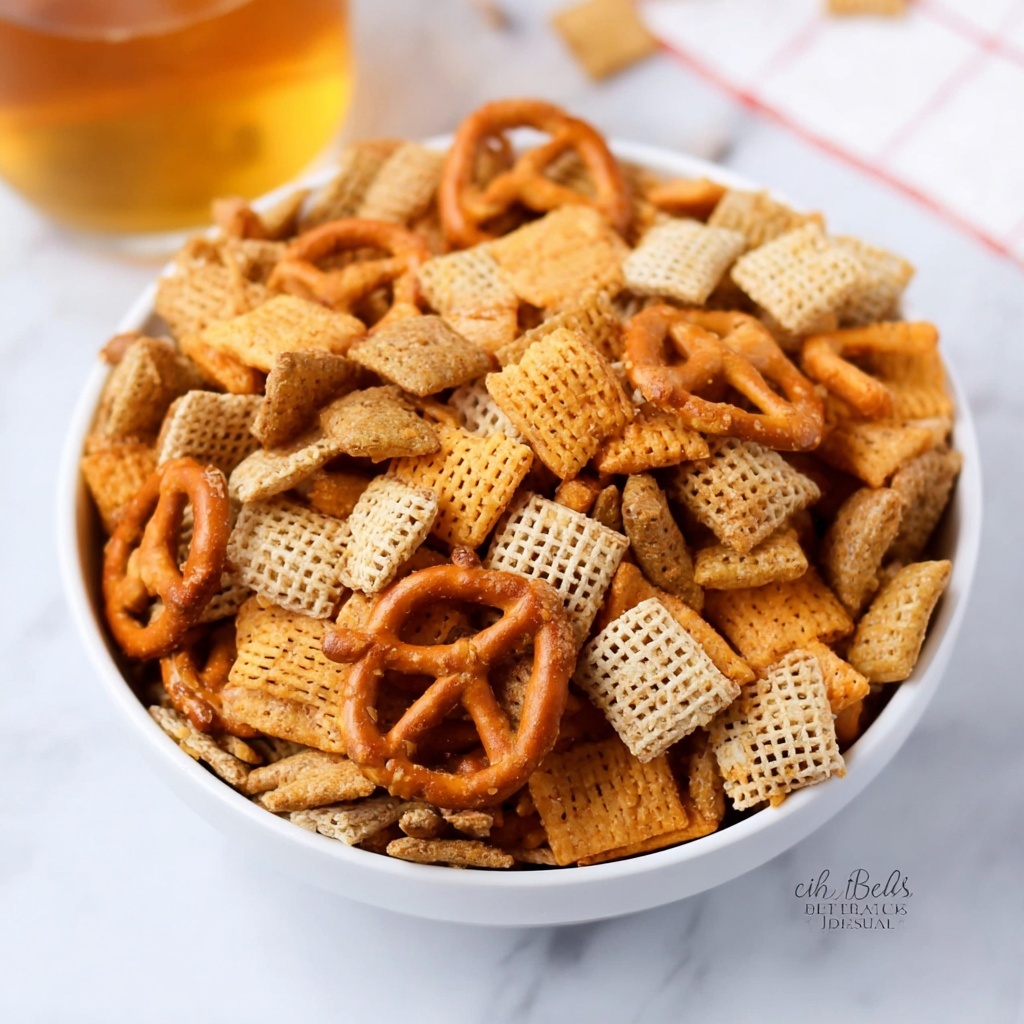 - Combine Dry Ingredients: Preheat the oven to 250°F. In a large bowl, add the Rice Chex, Corn Chex, pretzels, Cheez-Its, and bagel chips. Use a wooden spoon to gently stir and combine all the dry ingredients evenly.