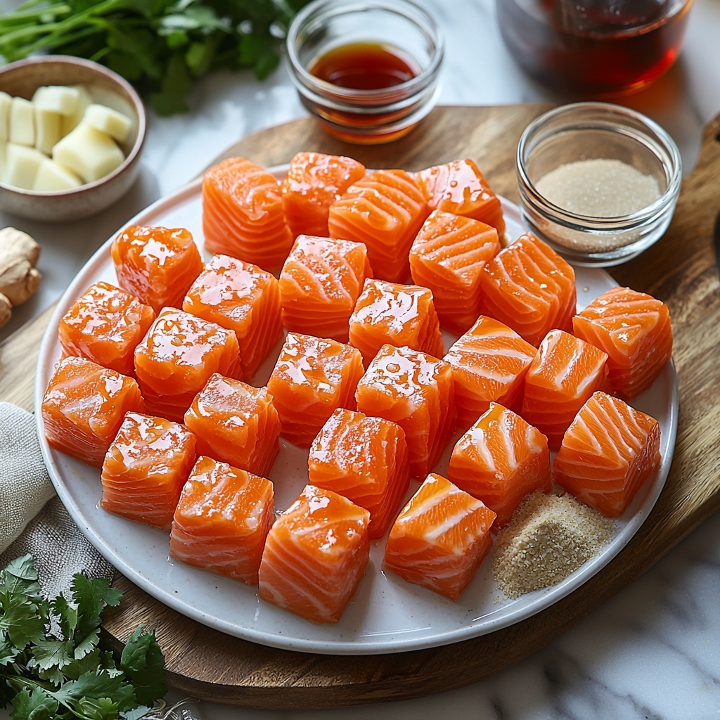 Place the cubed salmon in a large bowl and pour half of the prepared teriyaki sauce over it. Toss the pieces gently to coat them well, then cover and chill in the refrigerator for at least 10 minutes. This gives the flavors time to soak deep into the fish, making every bite a flavor bomb.