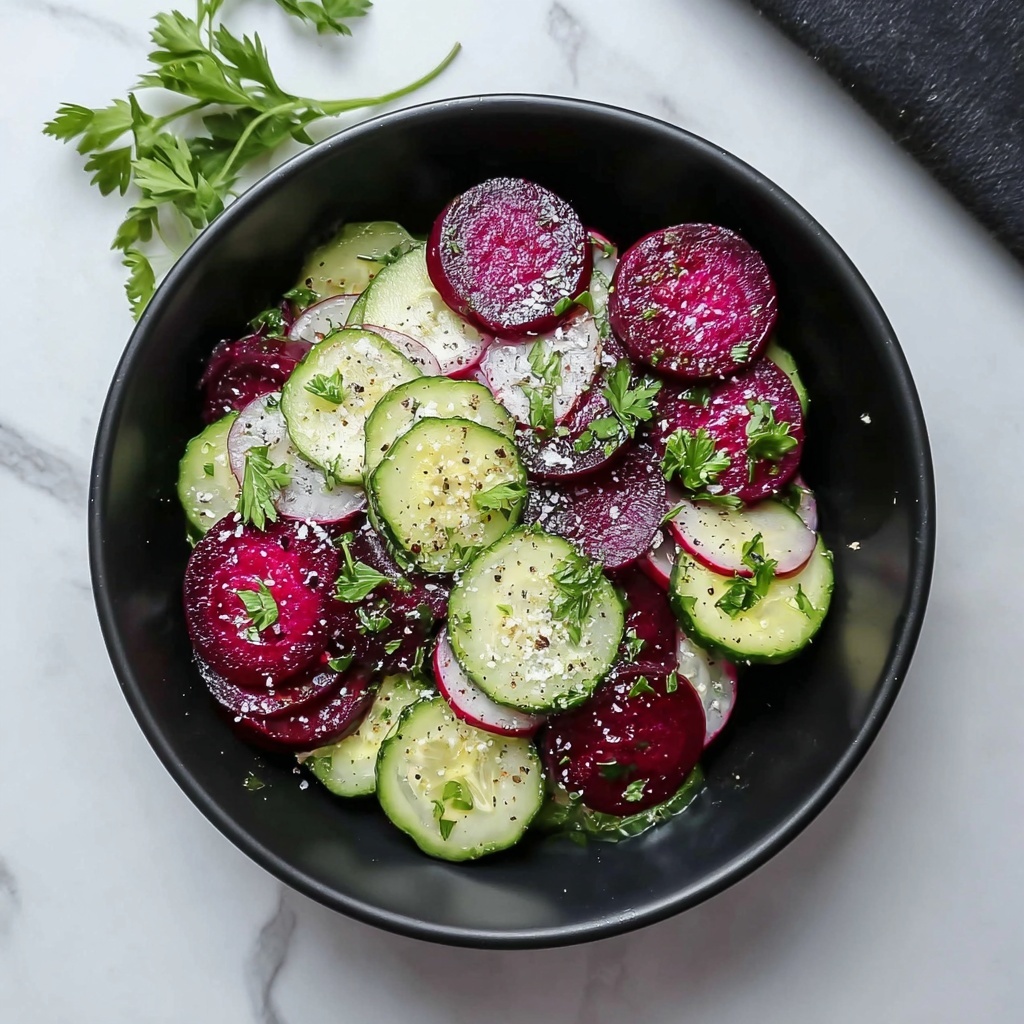 Brighten your Fresh Cucumber and Beet Salad Recipe by adding a few additional sprigs of parsley or a dusting of finely grated lemon zest on top. A light scatter of crumbled feta or goat cheese can also add a lovely creamy contrast, complementing the crisp textures.