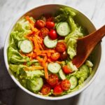 - Toss: Place all the salad ingredients—lettuce, tomatoes, cucumber, carrot, and parsley or chives—into a large bowl. Pour the dressing over the salad and toss thoroughly to ensure every bite is coated with the flavorful dressing.