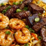This Garlic Butter Steak and Shrimp Stir-Fried Noodles recipe combines tender slices of sirloin or ribeye steak and succulent shrimp with savory garlic butter and a flavorful sauce, tossed with egg noodles for a quick and satisfying meal. Perfect for a hearty dinner, this dish is bursting with umami from soy and oyster sauces, highlighted by aromatic sesame oil and garnished with fresh green onions and optional red pepper flakes for heat.