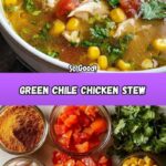 A flavorful and comforting Green Chile Chicken Stew featuring tender chicken thighs simmered with green chilies, tomatoes, corn, and aromatic spices. This hearty stew is perfect for a cozy meal and garnished with fresh cilantro and lime wedges for a zesty finish.