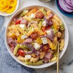 A vibrant and flavorful Grinder Pasta Salad featuring rotini pasta, savory salami, turkey breast, provolone cheese, and fresh veggies, all tossed in a tangy homemade dressing with mayonnaise, red wine vinegar, and banana pepper juice. Perfect for potlucks, picnics, or as a refreshing meal on a warm day.