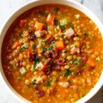 This hearty Ham and Lentil Soup is a comforting slow cooker recipe that combines smoky bacon, tender ham, and nutritious lentils in a flavorful tomato and herb broth. Perfect for a warming meal, it offers a rich blend of textures and savory taste achieved through a slow simmer that melds the ingredients beautifully.