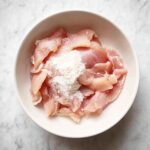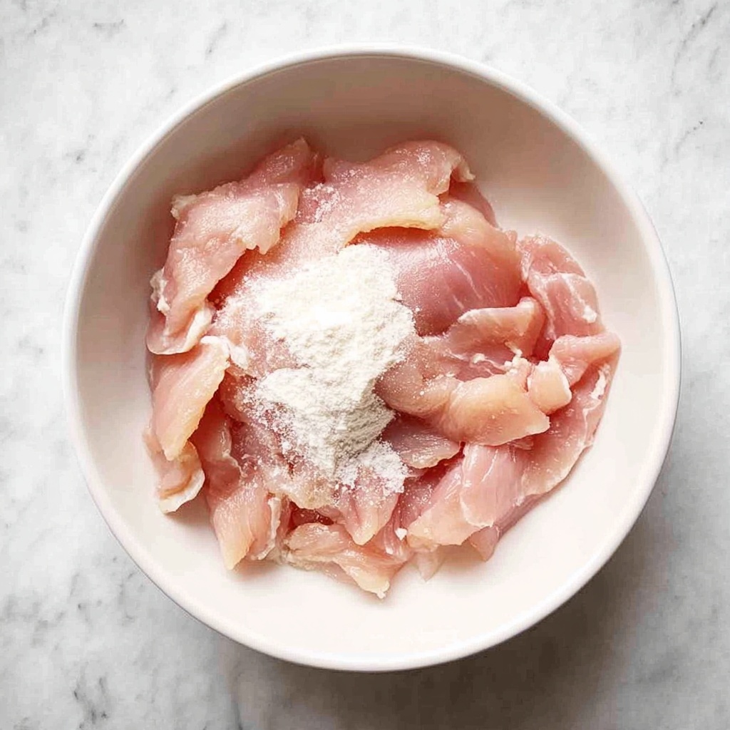 Start by placing your chicken slices or bite-size pieces in a mixing bowl. Sprinkle the baking soda evenly over the surface. This might feel a bit strange at first, but trust the process — this tiny sprinkle is where the magic begins!