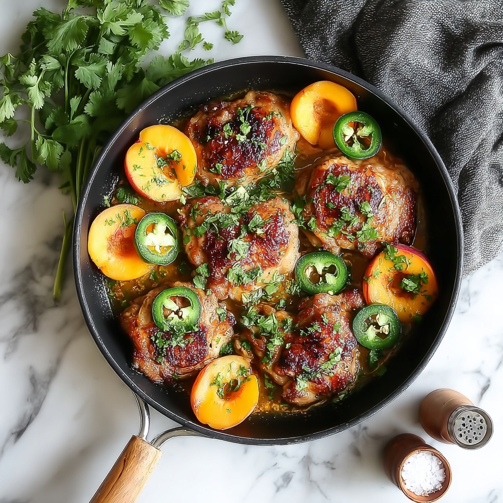 For a casual dinner, serve the chicken right from the skillet for a rustic vibe. If you’re entertaining, plate the chicken on a bed of rice or quinoa, spoon the sauce generously on top, and finish with a sprig of fresh herbs and a colorful peach slice to impress your guests visually and taste-wise.