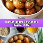 Korean Braised Potatoes, also known as Gamja Jorim, is a savory and slightly sweet side dish made by simmering baby potatoes in a flavorful soy-based glaze. This popular Korean recipe features tender potatoes coated in a rich sauce with hints of garlic, honey, and sesame, garnished with green onions and toasted sesame seeds for a delightful finish.