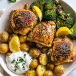 This Lemon Garlic Chicken with Parmesan Herb Sauce is a flavorful and comforting one-pan meal featuring tender marinated chicken thighs, roasted baby Dutch potatoes, and broccoli florets. The dish is elevated with a tangy and creamy Greek yogurt sauce blended with Parmesan cheese and fresh herbs, delivering a delightful balance of zest, creaminess, and herbs perfect for a family dinner.