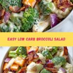 A refreshing, low carb broccoli salad packed with crunchy vegetables, savory bacon, and creamy dressing. This salad combines fresh broccoli and cauliflower florets with crispy bacon, Colby Jack cheese, and a tangy, slightly sweet yogurt-based dressing for a delicious and healthy side dish or light meal.