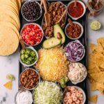 Create a delightful and customizable taco board featuring a variety of taco shells, proteins, fresh vegetables, and toppings perfect for a fun and interactive meal with family and friends.