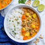 To finish, stir in the creamy peanut butter, savory soy sauce, tangy lime juice, sugar, and crunchy peanuts. These last touches elevate the curry, balancing richness, acidity, and texture. Serve piping hot over fluffy basmati rice and sprinkle with freshly chopped cilantro for a burst of freshness.