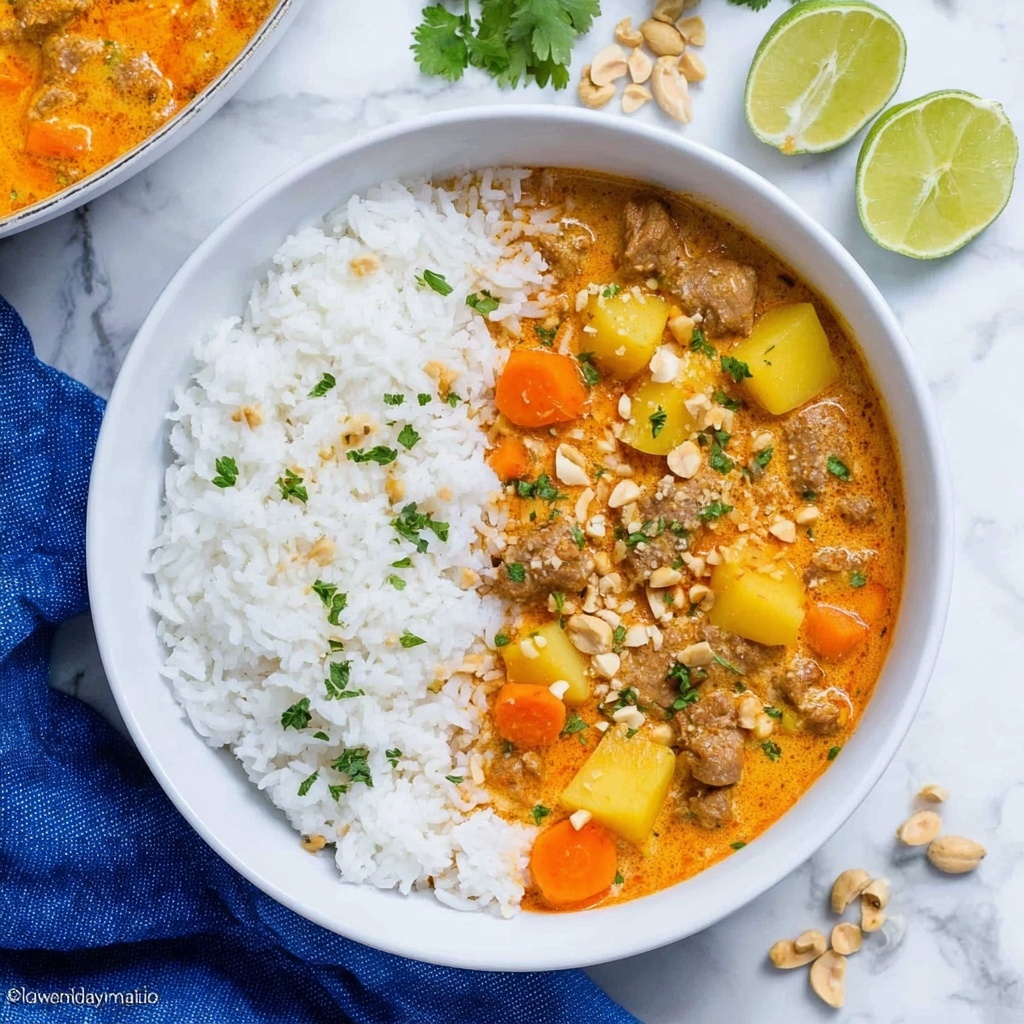 This Massaman Chicken Curry recipe is a rich and flavorful Thai-inspired dish featuring tender chicken thighs simmered in creamy coconut milk with warm spices, potatoes, carrots, and a hint of peanut butter. Perfect served over basmati rice and garnished with fresh cilantro and crunchy peanuts, this meal combines a harmonious blend of savory, sweet, and tangy notes for a comforting dinner.