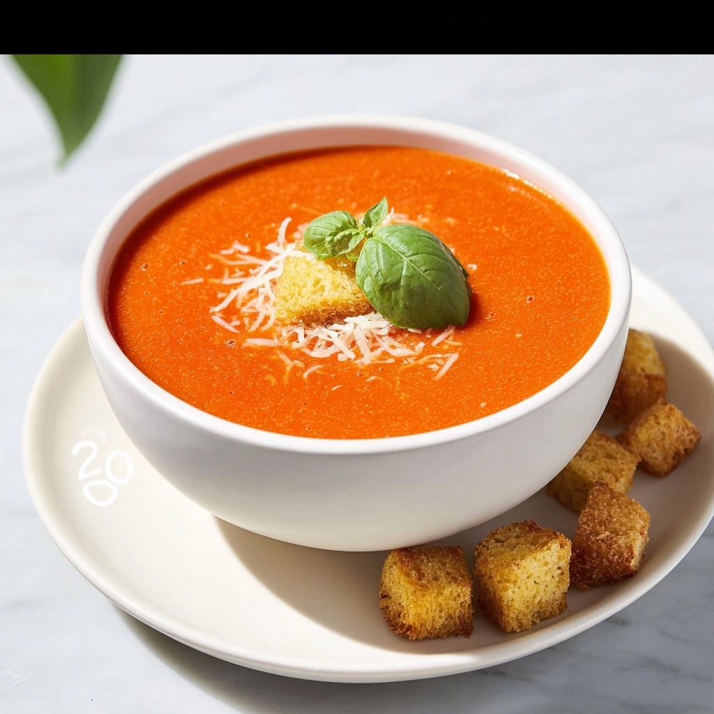 Sprinkling grated Parmesan gives a nutty, salty kick that melts slightly into the warm soup, while crunchy croutons add texture and make every bite exciting. Fresh basil leaves on top brighten the presentation and add a fragrant herbal note that elevates the whole experience.