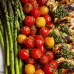 Transfer the vibrant mixture of chicken, tortellini, and tomatoes onto the serving plate alongside the tender asparagus spears. Serve warm and prepare to delight in the harmonious flavors and textures that make the Pesto Chicken Tortellini with Veggies Recipe such a standout meal.