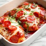 This Pizza Chicken recipe combines juicy seared chicken breasts with classic pizza flavors such as tomato sauce, mozzarella cheese, pepperoni, and fresh basil. It’s an easy, oven-baked dish perfect for a flavorful weeknight dinner that brings the taste of pizza in a protein-packed form.