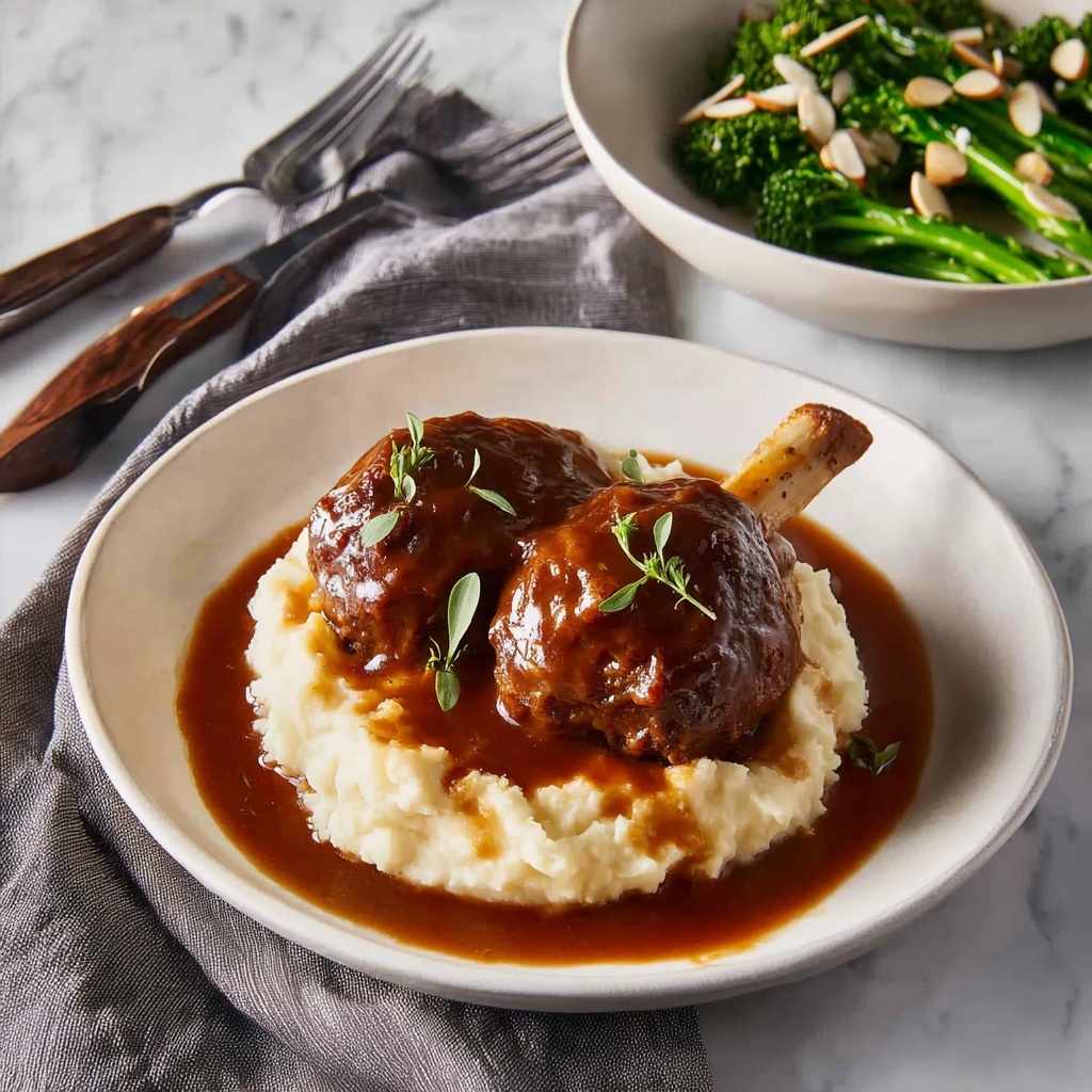 Reheat the lamb shanks slowly over low heat to keep the meat tender and the sauce silky. Add a splash of broth or water if the sauce thickens too much. Avoid microwaving as it can dry the meat and cause the sauce to separate.