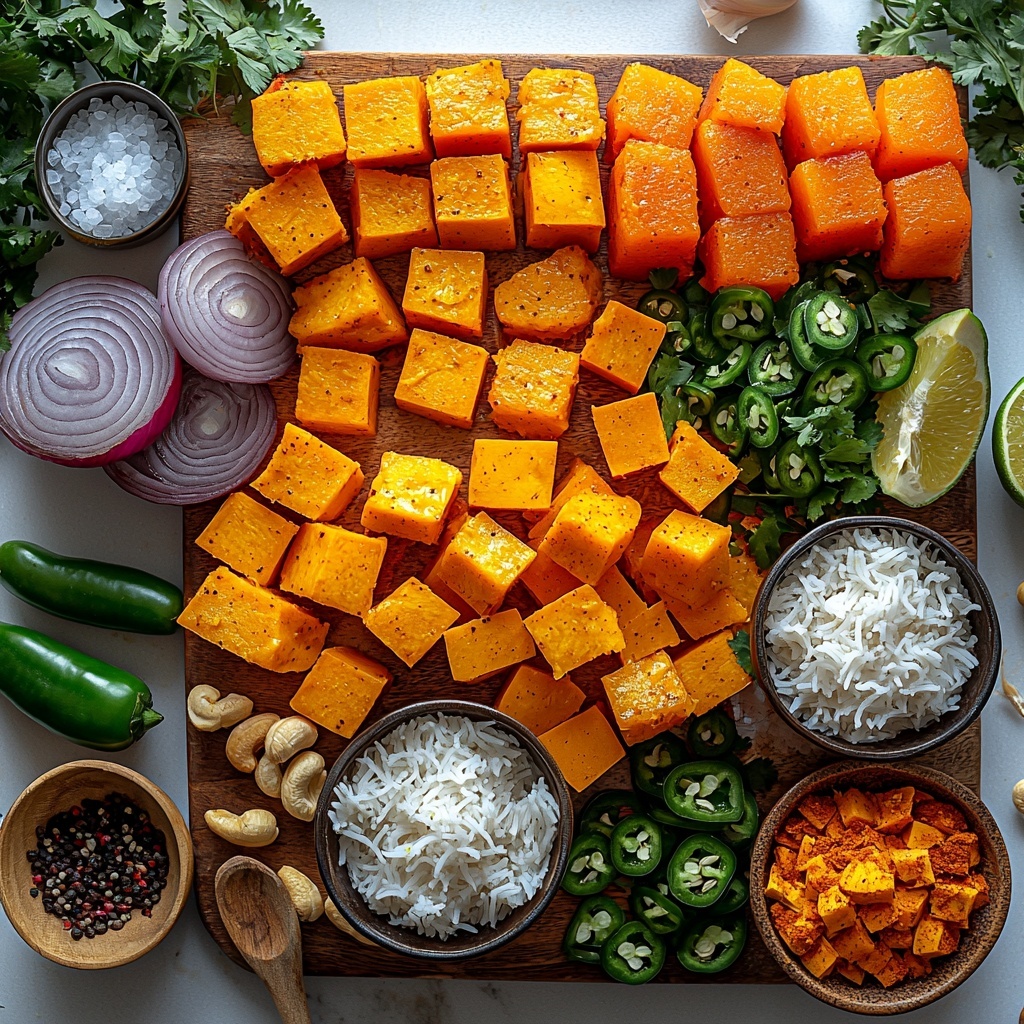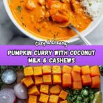 This vibrant and creamy Pumpkin Curry recipe combines tender cubes of pumpkin with fragrant spices, red curry paste, and rich coconut milk for a flavorful vegetarian dish. Served over fragrant basmati rice and garnished with crunchy cashews and fresh cilantro, this curry offers a comforting yet exotic meal perfect for any season.
