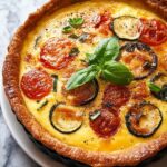 This Roasted Ratatouille Quiche combines the rich flavors of roasted Mediterranean vegetables with creamy cheeses baked in a flaky pie crust, creating a savory tart perfect for brunch, lunch, or a light dinner. The roasted zucchini, eggplant, bell peppers, and onion bring sweetness and depth, complemented by a smooth custard mixture of eggs, cream, mozzarella, and Parmesan. Fresh basil garnish adds a bright finish to this comforting and elegant dish.