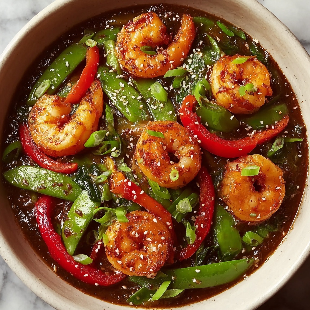 A vibrant and flavorful Asian-inspired shrimp stir-fry featuring fresh ginger, garlic, crisp vegetables, and a savory-sweet sauce, perfect served over jasmine rice or noodles for a quick and satisfying meal.