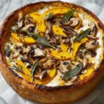 This Savory Wild Mushroom Roasted Squash Pizza features a homemade dough topped with sweet, roasted butternut squash, earthy wild mushrooms sautéed with garlic, and a blend of mozzarella and goat cheese. Garnished with fresh thyme or rosemary, it’s a perfect fall-inspired vegetarian pizza bursting with rich flavors and textures.
