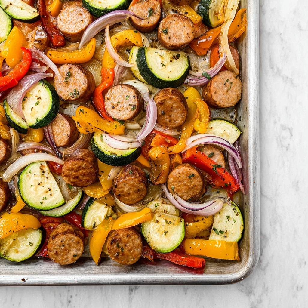 A quick and easy Sheet Pan Sausage Dinner featuring sliced sausage, colorful bell peppers, zucchini, and red onion, all seasoned with a blend of paprika, garlic, and onion powders. This one-pan meal is baked to perfection at 400°F, making it a convenient and flavorful weeknight dinner option.