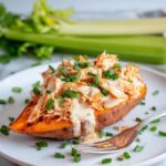 - Serve: Once cooked, plate a sweet potato and a portion of the buffalo chicken. Drizzle with the prepared creamy buffalo sauce and garnish with 1 tablespoon chopped chives or green onion for a fresh finish.