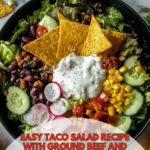 This vibrant Taco Salad combines seasoned ground beef, fresh vegetables, and crunchy tortilla chips, all topped with cheesy, creamy, and zesty flavors. Perfect for a quick and hearty meal, this salad layers fresh shredded lettuce, juicy cherry tomatoes, black beans, and tangy salsa for a balanced and flavorful Tex-Mex inspired dish.