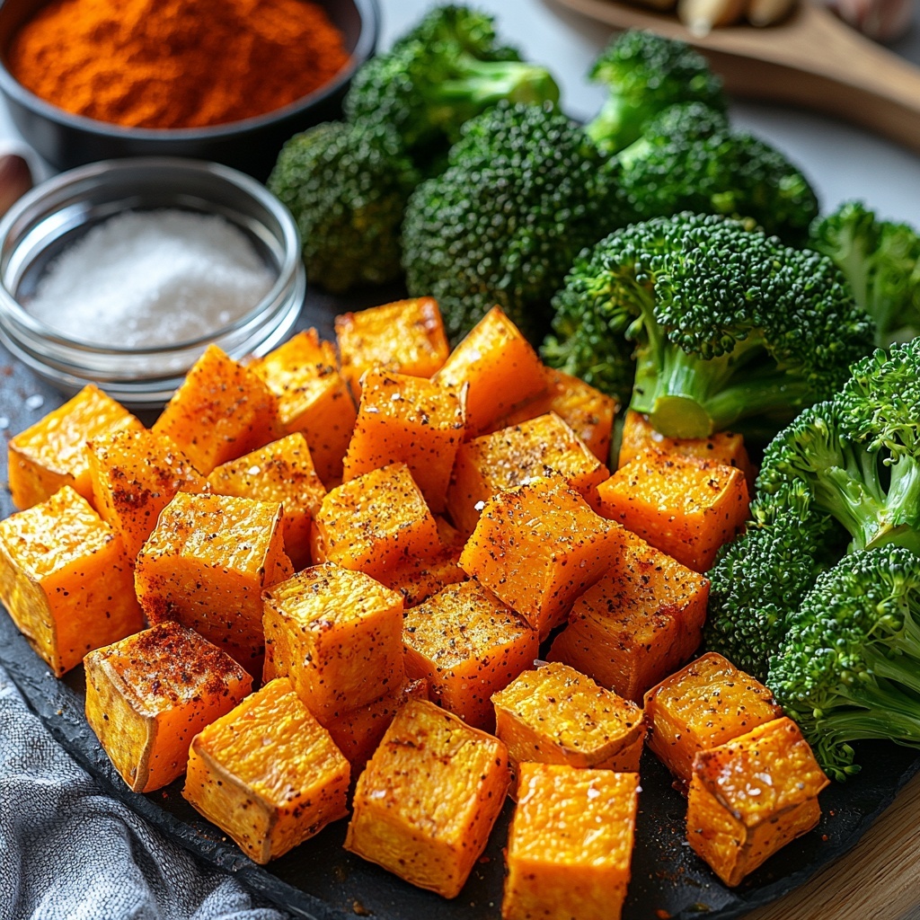 - Season the Vegetables: In a large mixing bowl, combine the sweet potatoes and broccoli. Drizzle olive oil over them, then sprinkle smoked paprika, garlic powder, onion powder, cayenne pepper, salt, and black pepper. Toss everything thoroughly until the vegetables are evenly coated with the oil and seasonings.
