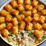 This Tater Tot Chicken Pot Pie combines the classic comfort of a creamy chicken pot pie filling with a crispy, golden tater tot topping. It’s an easy, crowd-pleasing casserole perfect for weeknight dinners or family gatherings, featuring tender chicken and vegetables in a savory sauce baked to perfection.