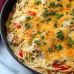 Start by preheating your oven to 350°F (175°C) so it’s ready to go once everything is combined. Grease a 9×13-inch baking dish generously to ensure your cheesy spaghetti doesn’t stick and can be served easily.