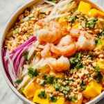 Start by layering your bowl with fresh, crunchy ingredients: napa cabbage, jicama, green mango, red onion, and scallions. If your shrimp aren’t prepped yet, peel and cook them ahead of time, but hold off on mixing them in until just before serving to keep everything as fresh and bright as possible.