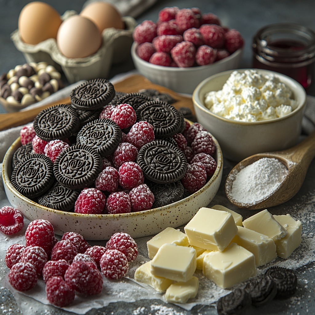 Each ingredient in this cheesecake plays a crucial role, contributing to its rich, creamy texture, vibrant flavor, and irresistible appearance. From the crunchy Oreo cookie crust to the silky white chocolate in the batter and the fresh raspberry swirls, every component is thoughtfully chosen to create perfection.